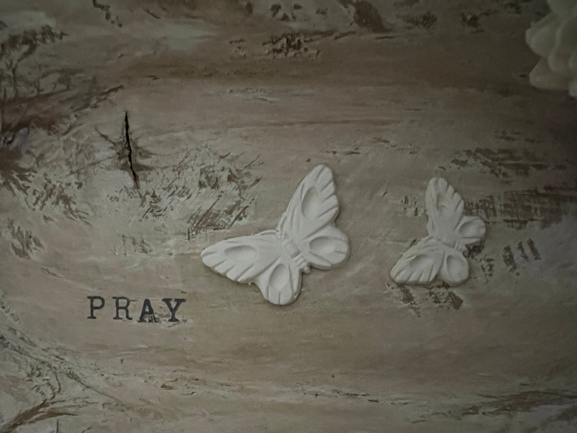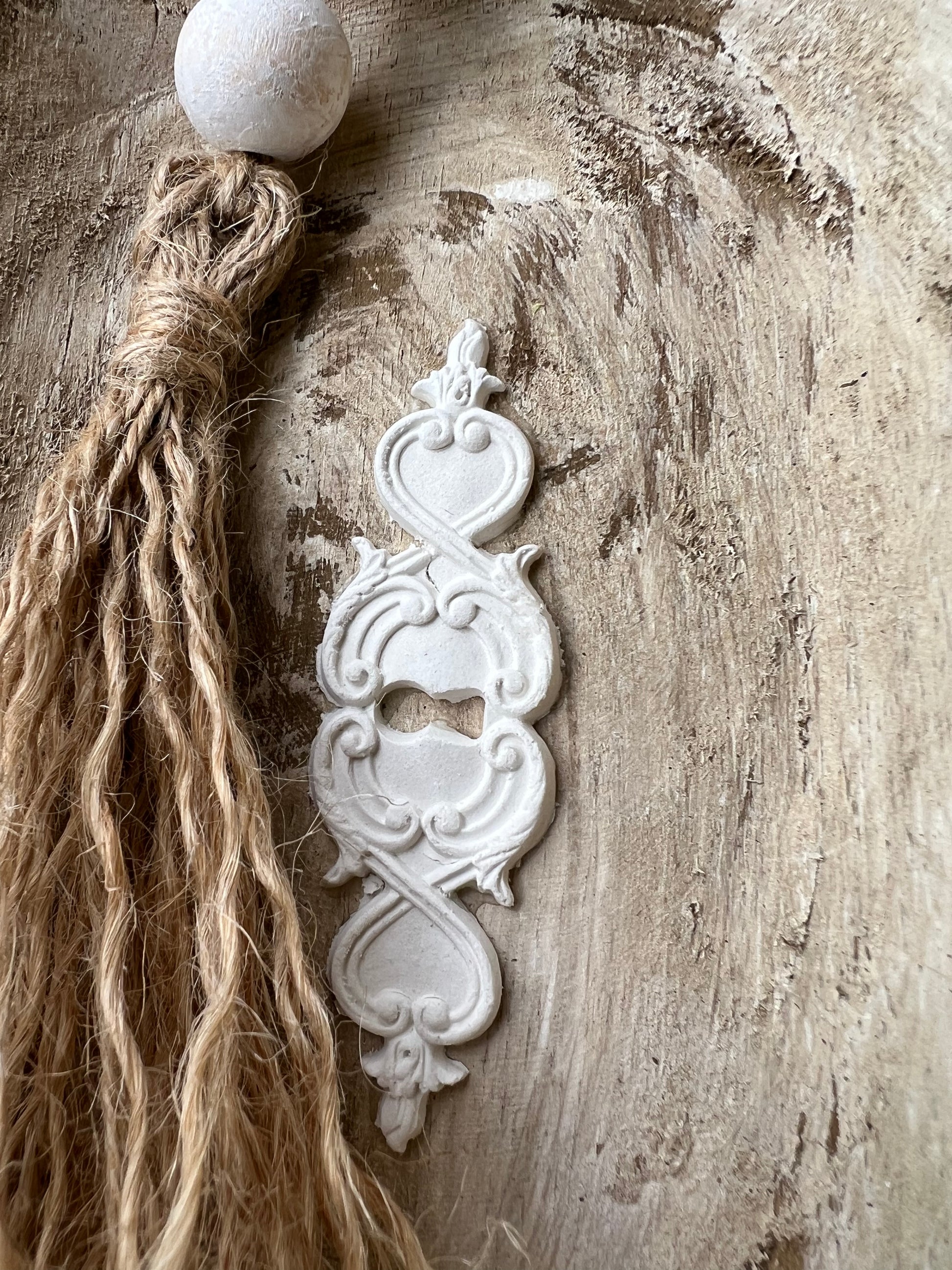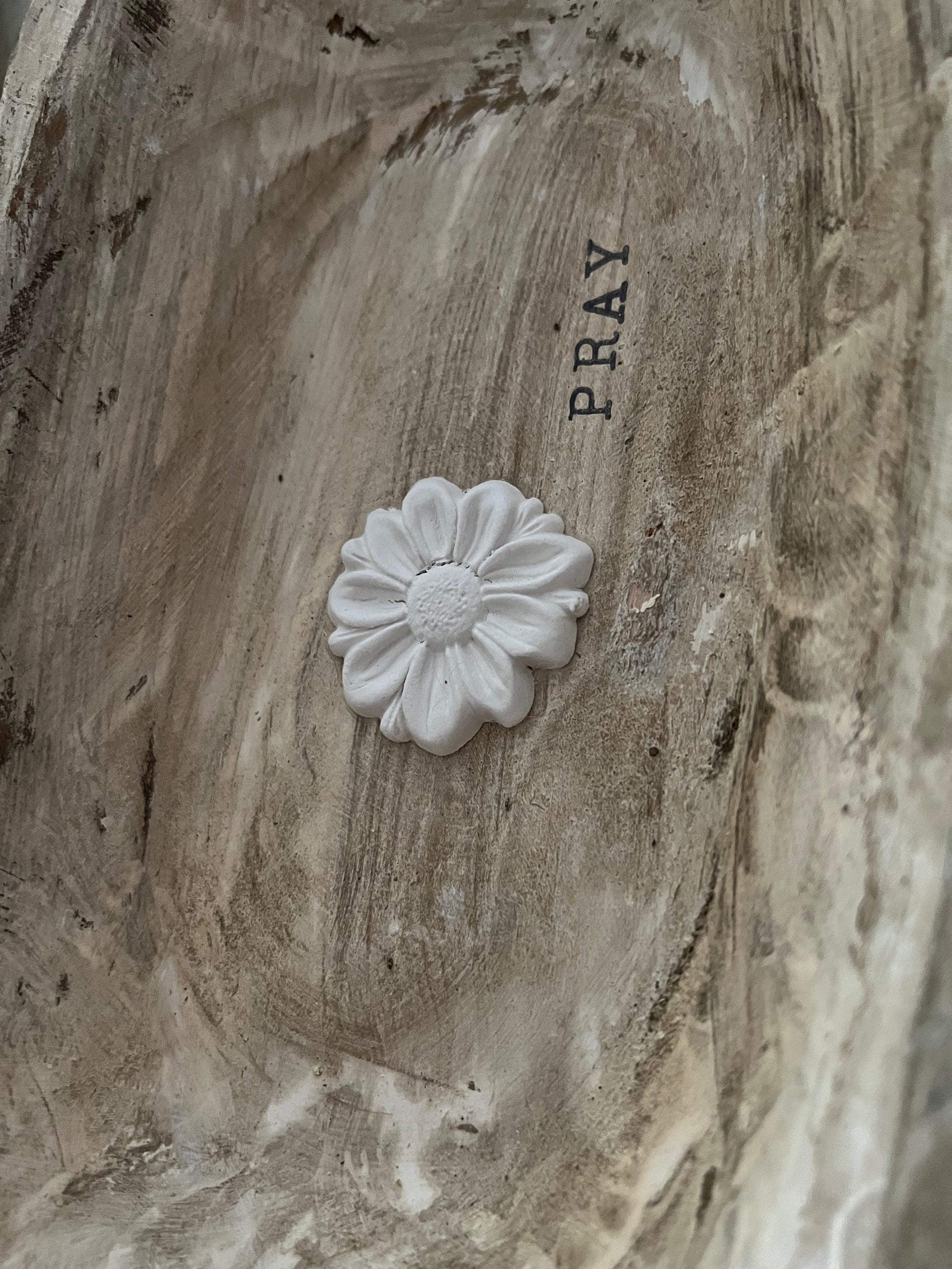 WHITE DISTRESSED WOODEN PRAYER BOWL WITH DISTRESSED BEADED TASSEL