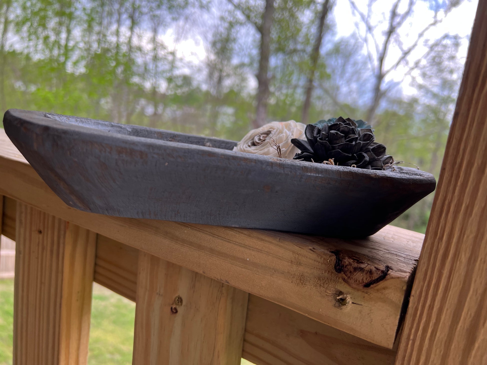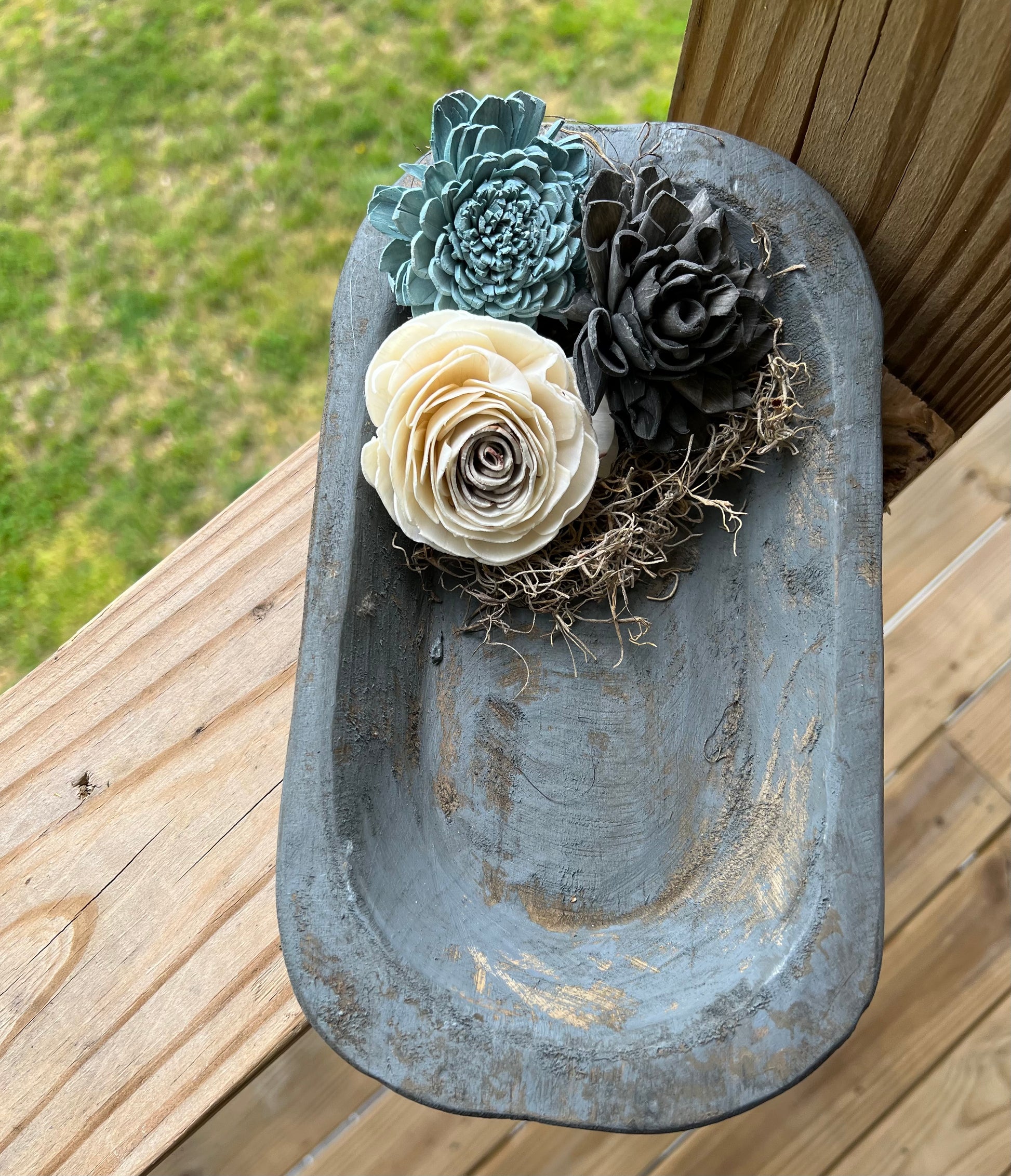 WEATHERED GREY CARVED DOUGH BOWLS WITH WOODEN FLOWERS IN ASSORTED COLORS. FEEL FREE TO SEND US AN EMAIL TO REQUEST A SPECIFIC COLOR. EMAIL; amy@swirlsblings.com.